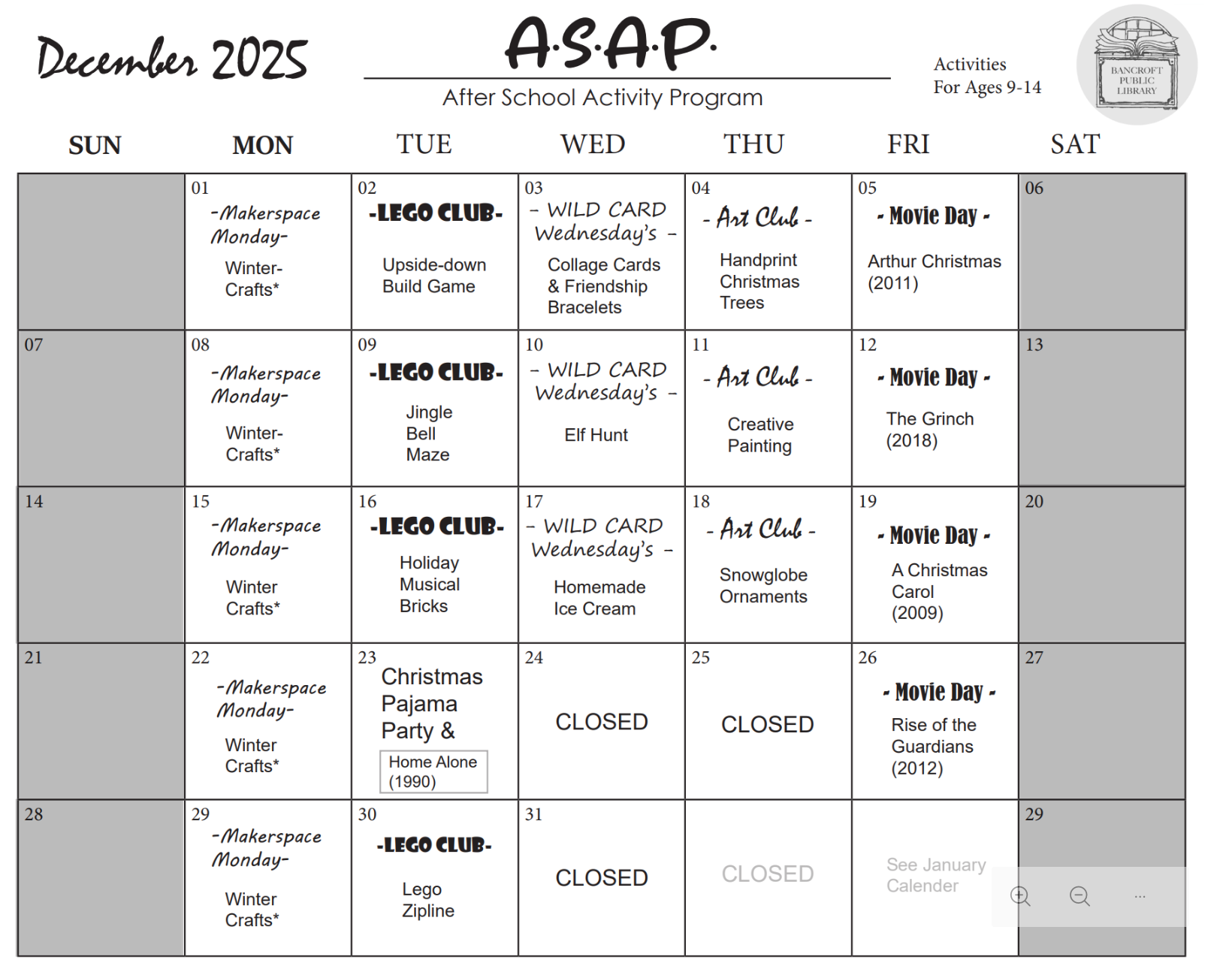 There is an After-School Activity Program at Bancroft Public Library. Each weekday from 2:30 pm until 4:00 pm Bancroft offers kids the chance to come and hang out at the library! The after-school activity program gears activities to kids ages 9 – 14 years. Younger children are welcome to come with an adult in attendance. Activities include art and crafts, technology, games, lego club, and more! See calendar below for an idea of what things happen each week. Note: daily program may change due to unforeseen circumstances.