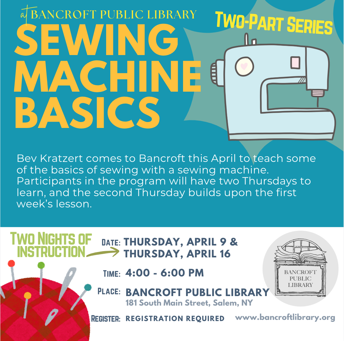| Description | Bev Kratzert comes to Bancroft this April to teach some of the basics of sewing with a sewing machine. Participants in the program will have two Thursdays to learn, and the second Thursday builds upon the first week’s lesson. |