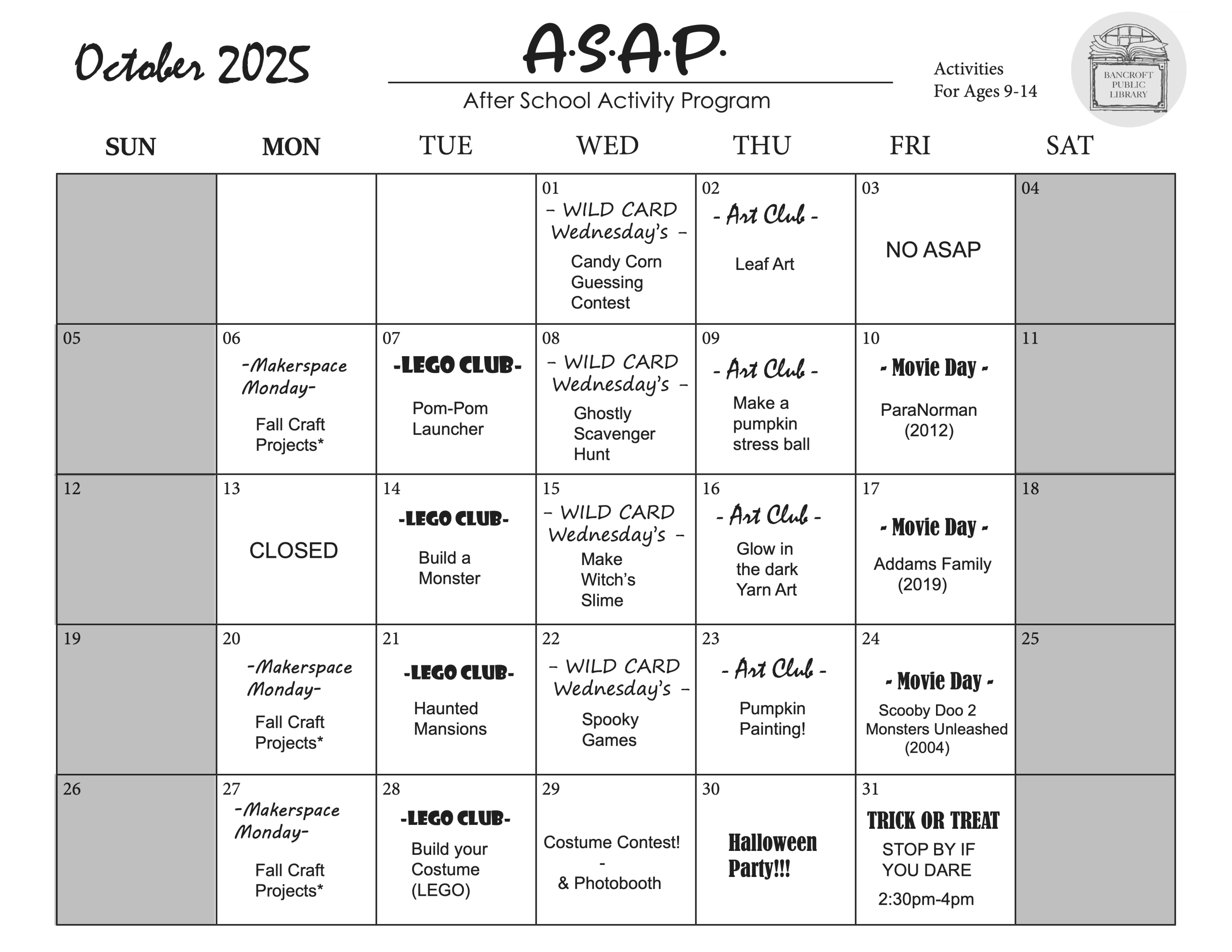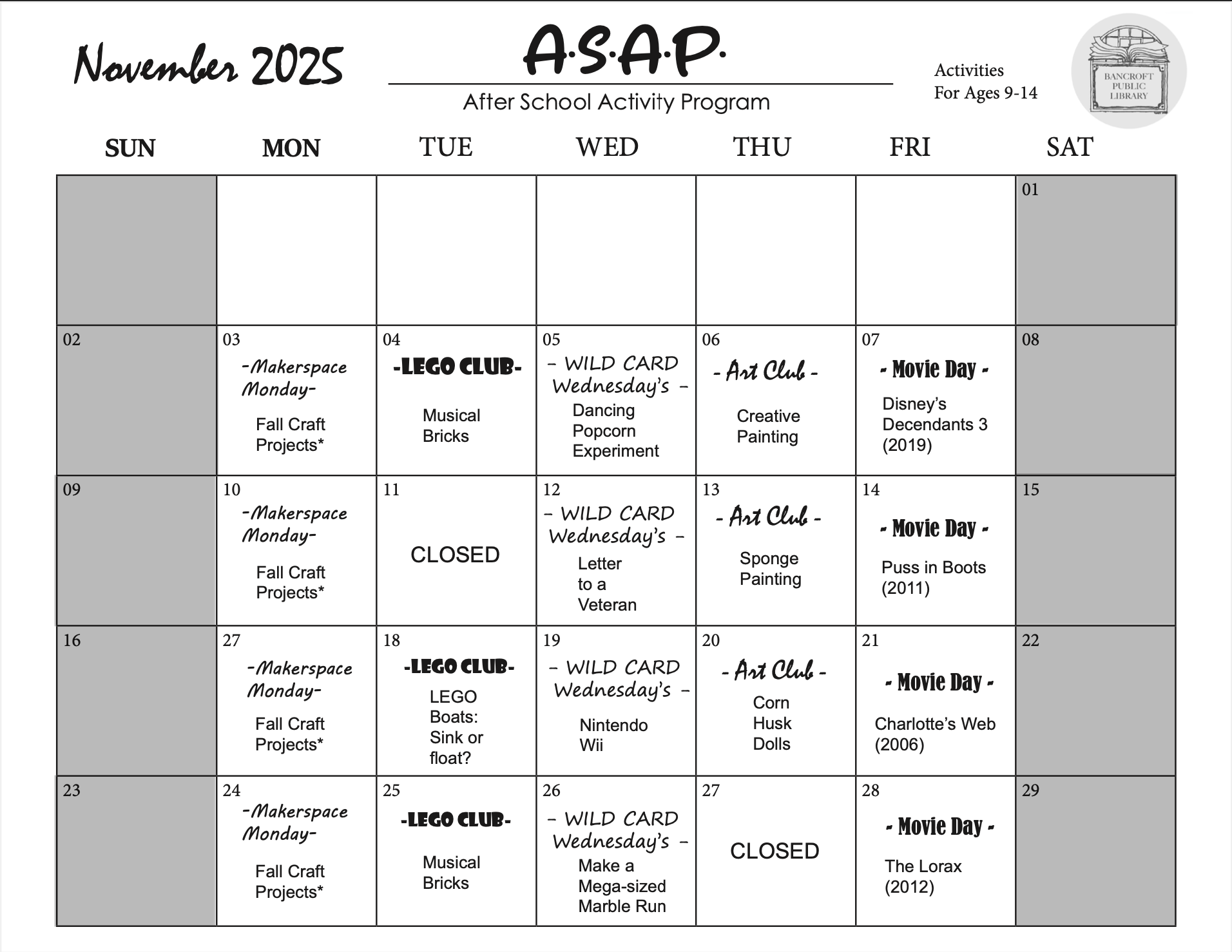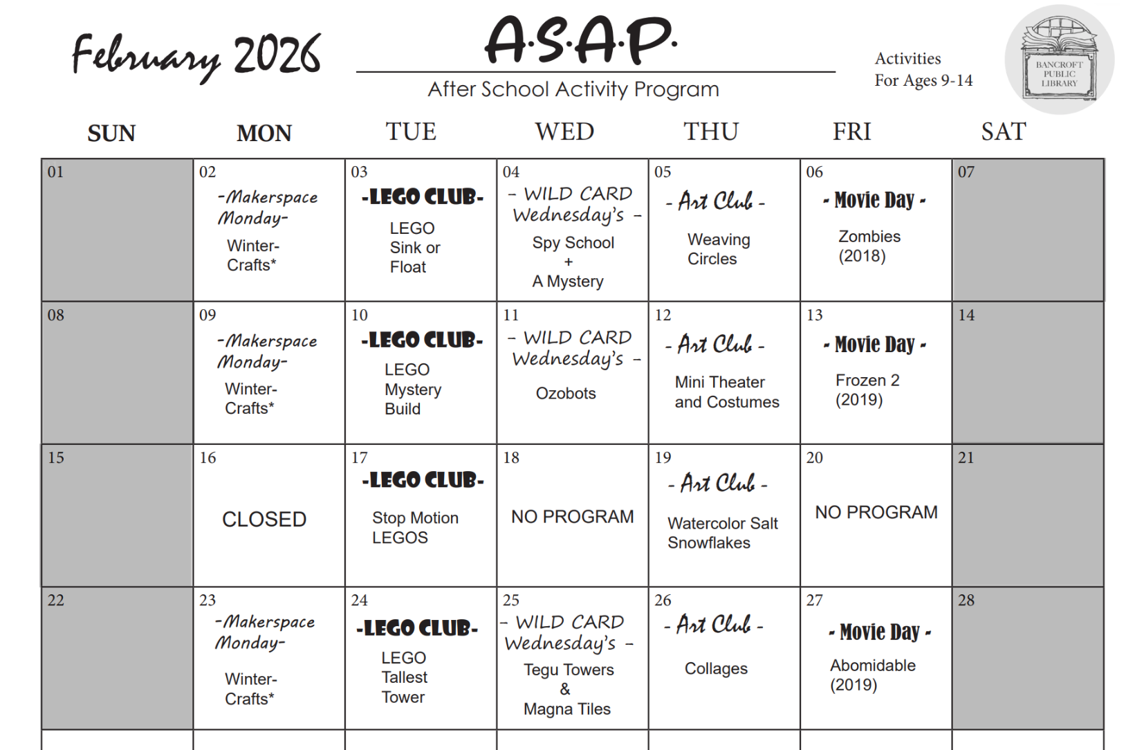 There is an After-School Activity Program at Bancroft Public Library. Each weekday from 2:30 pm until 4:00 pm Bancroft offers kids the chance to come and hang out at the library! The after-school activity program gears activities to kids ages 9 – 14 years. Younger children are welcome to come with an adult in attendance. Activities include art and crafts, technology, games, lego club, and more! See calendar below for an idea of what things happen each week. Note: daily program may change due to unforeseen circumstances.