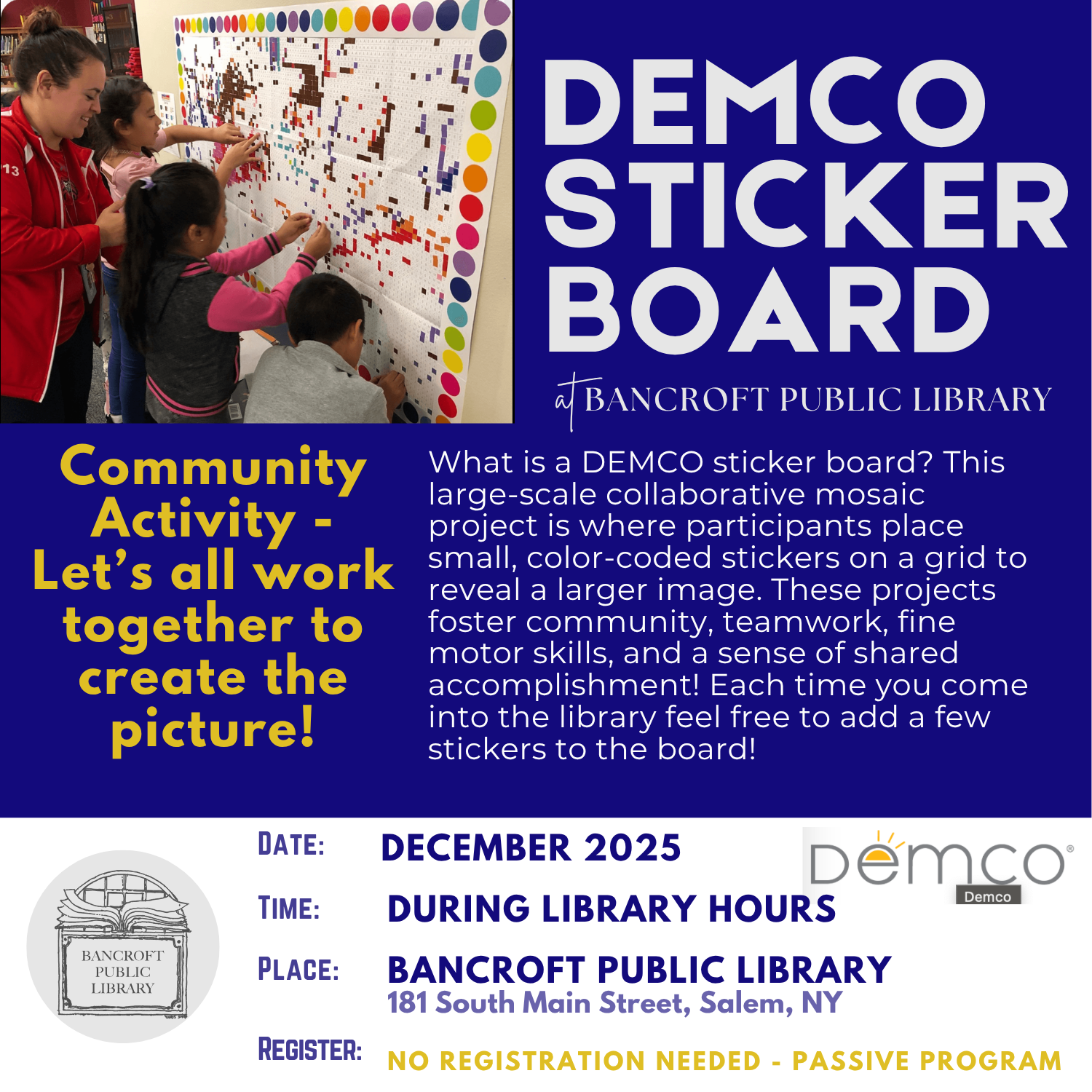 | Description | What is a DEMCO sticker board? This large-scale collaborative mosaic project is where participants place small, color-coded stickers on a grid to reveal a larger image. These projects foster community, teamwork, fine motor skills, and a sense of shared accomplishment! Each time you come into the library feel free to add a few stickers to the board! |