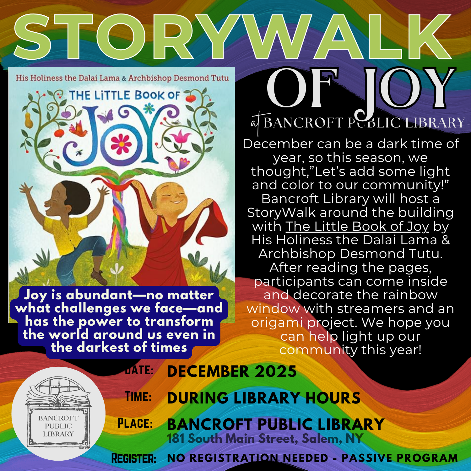 | Description | December can be a dark time of year, so this season, we thought, “Let’s add some light and color to our community!” Bancroft Library will host a StoryWalk around the building with The Little Book of Joy by His Holiness the Dalai Lama & Archbishop Desmond Tutu. After reading the pages outside in the courtyard and around the building, participants can come inside and decorate the rainbow window with streamers and an origami project. We hope you can help light up our community this year and you’ll find some joy to carry with you! The StoryWalk® Project was created by Anne Ferguson of Montpelier, VT and developed in collaboration with the Kellogg-Hubbard Library. Storywalk® is a registered service mark owned by Ms. Ferguson. |