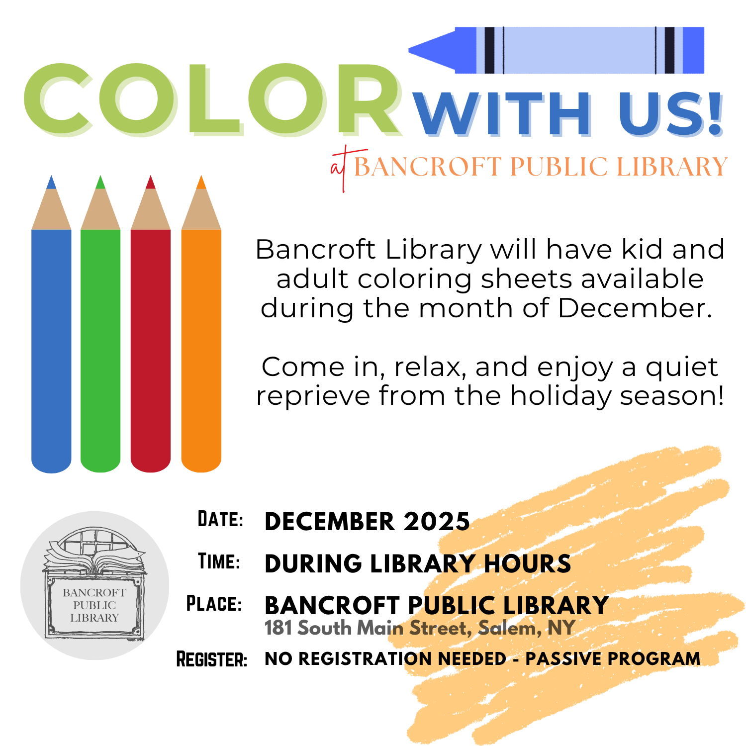 | Description | Bancroft Library will have kid and adult coloring sheets available during the month of December. Come in, relax, and enjoy a quiet reprieve from the holiday season or join together with friends for a fun way to be together! |