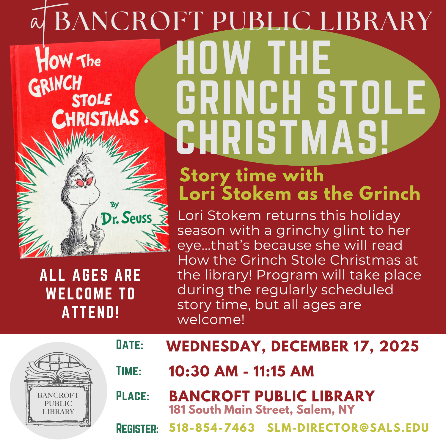 | Description | Lori Stokem returns this holiday season with a grinchy glint to her eye…that’s because she will read How the Grinch Stole Christmas! at the library! Program will take place during the regularly scheduled story time, but all ages are welcome! |