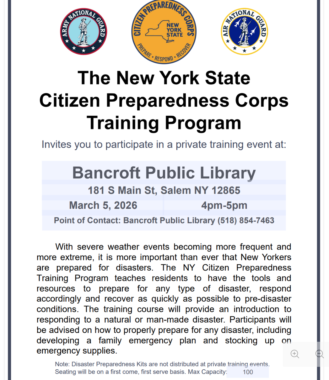 | Description | With severe weather events becoming more frequent and more extreme, it is more important than ever that New Yorkers are prepared for disasters. The NY Citizen Preparedness Training Program teaches residents to have the tools and resources to prepare for any type of disaster, respond accordingly and recover as quickly as possible to pre-disaster conditions. The training course will provide an introduction to responding to a natural or man-made disaster. Participants will be advised on how to properly prepare for any disaster, including developing a family emergency plan and stocking up on emergency supplies. |